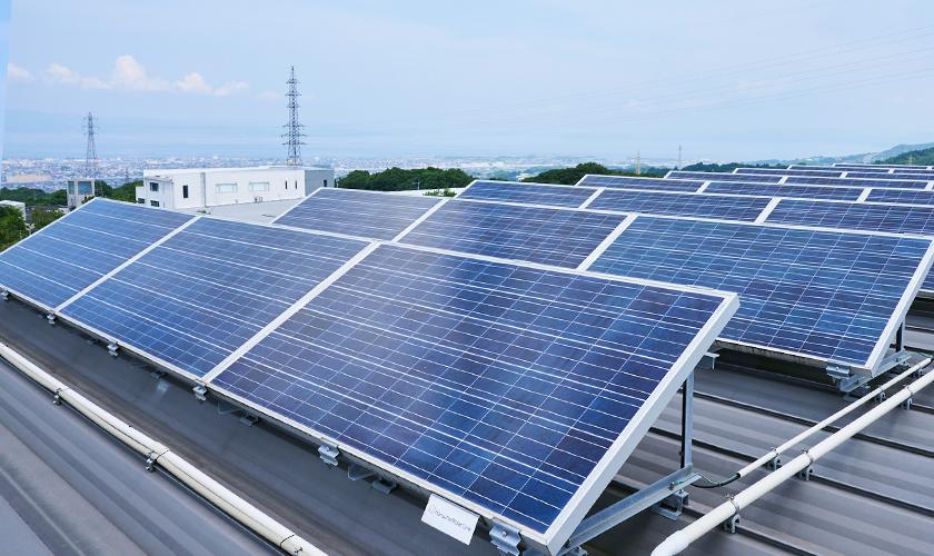 長崎工場の屋上には太陽光発電システムが設置されています。地球資源のリサイクルを主事業とする当社は、このような形でも環境負荷の軽減に繋がる活動をしています。工場電力の一部を太陽光発電システムでまかなうことで温室効果ガス発生を低減させています。