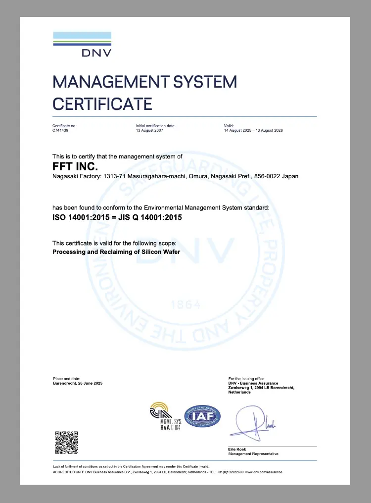 FFT INC. recognizes that "passing on the irreplaceable global environment to the next generation in a healthy condition is the basic responsibility of existing human beings," and is our main business, "Reclaimng silicon wafers." Recognizing that "business" can contribute to reducing the environmental burden in the semiconductor industry, we will promote business development and efficient activities.